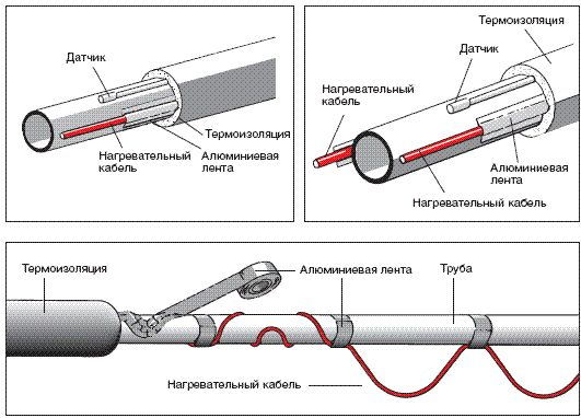 Если кабель обкручивается вокруг пластиковой трубы, ее поверхность также обматывают скотчем на алюминиевой основе.