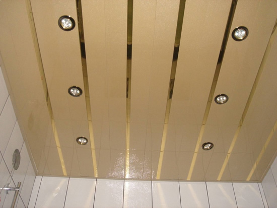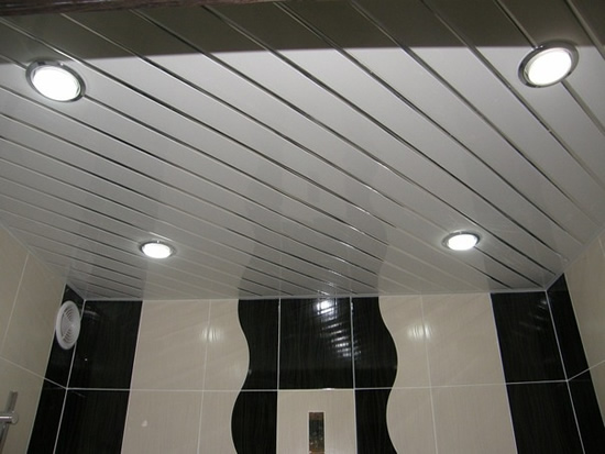 Среди типовых моделей наиболее популярен пластиковый реечный потолок для ванной.