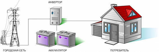 - Система с инвертором, аккумулятором и автономным источником энергии.