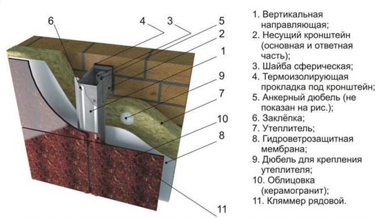 Разделить устройство вентилируемого фасада из керамогранита возможно на четыре составляющие: